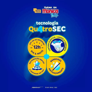 Para isso, a nova Fralda Turma da Mônica Baby conta com exclusiva tecnologia Qu4troSec, que possui um exclusivo sistema de canal que distribui mais rápido o xixi, barreiras antivazamento e uma fina camada extra que ajuda a manter o bebê sequinho por até 12 horas, além de ter cintura elástica, que proporciona um perfeito ajuste no corpinho, fazendo com que ele fique seguro durante o dia e a noite toda.